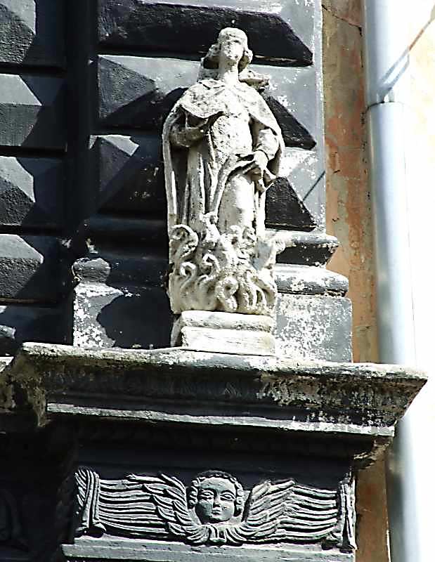 Скульптура невідомого мені святого на правій пілястріРозмір зображення: 619:800 піксел 14 вересня 2007 р. Фото М.І.Жарких. |