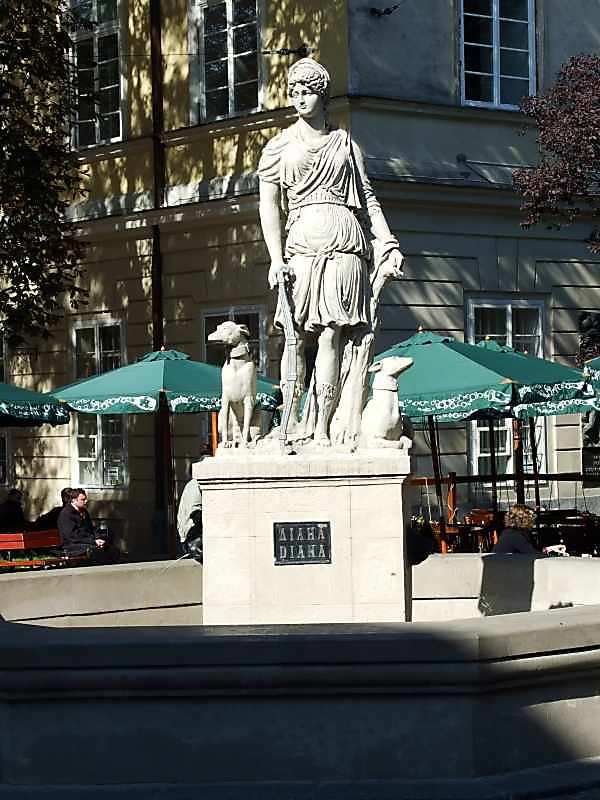 Фонтан Диана. Расположен на юго-восточном углу площади. [Памятники градостроительства и архитектуры УССР. – К.: Будівельник, 1985 г., т. 3, с. 62].