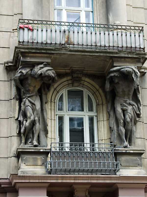 Балкон 3-го поверху Розмір зображення: 600:800 піксел 4 квітня 2012 р. Фото М.І.Жарких. Вкладені елементи Ліва постать атланта Права постать атланта