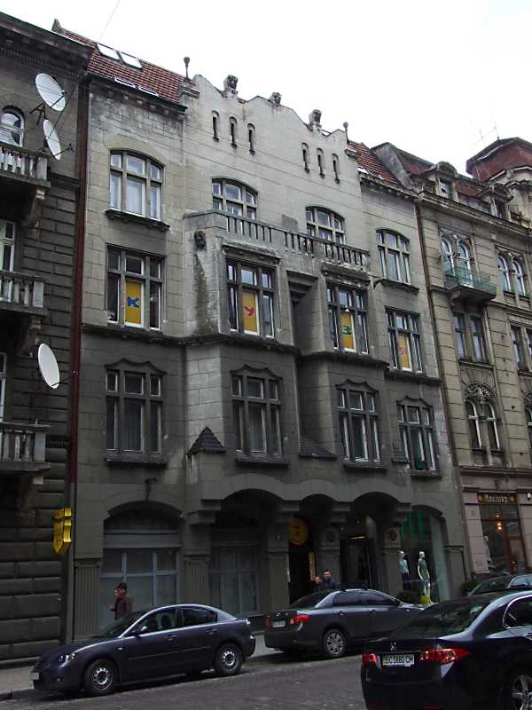 Будинок (вул.Саксаганського, 9) споруджено в 1911 р. (архіт. А.Захаревич, скульптор З.Курчинський) у стилі сецесії.