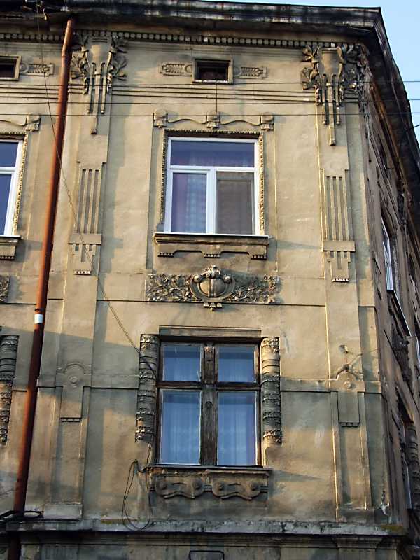 2013 р. Фрагмент фасаду Розмір зображення: 600:800 піксел 16 квітня 2013 р. Фото М.І.Жарких. Вкладені елементи Сецесійна рельєфна вставка