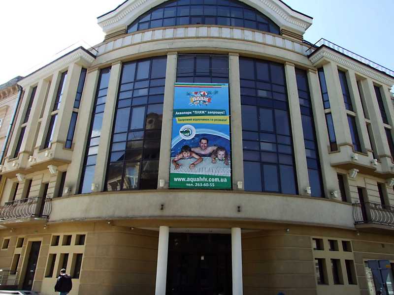 Банк (№ 32)Розмір зображення: 800:600 піксел Ліворуч – вулиця Драгоманова, праворуч – площа Грушевського. 16 квітня 2013 р. Фото М.І.Жарких. |