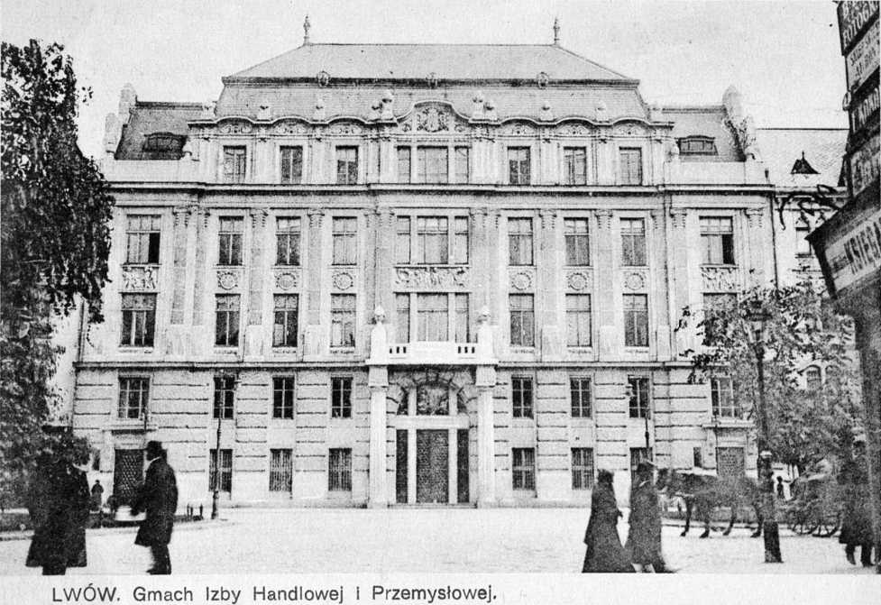 Поштівка: будинок торговельно-промислової палати у Львові. – Lwów, gmach Izby Handlowej i Przemysłowej. W Krakowie : Wydawnictwo Salonu Malarzy Polskich, [ca 1925] (Kraków : Zakłady Reprodukcyjne «Akropol») (pocztówka); 9 × 14 cm