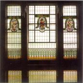 Виконані в 1908 р. за проектом Захаревича вітражі заповнюють вікна четвертої стіни й акомпанують панно та горельєфам у формуванні емоційної атмосфери інтер’єру. Оздоблені маскаронами Курчинського дубові панелі (майстерня С. Крука) завдяки своєму темному брунатно-чорному тону поглинають світлоколірні потоки від вітражів і ніби розширюють простір приміщення. Загальний художній устрій залу є поліфонічним, майже музичним.