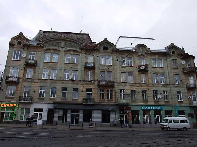 Праворуч – фасад будинку по вул. Леонтовича, 1/2. 8 квітня 2012 р. Фото М.І.Жарких.