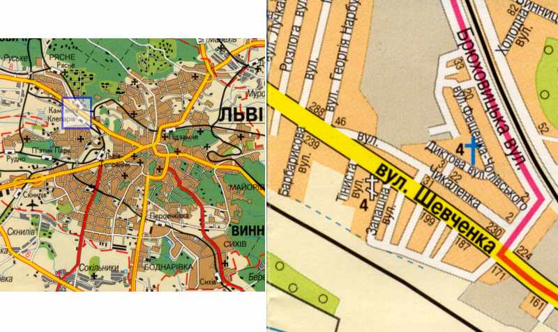 Ситуаційний план (церква позначена білим хрестом – 4)Розмір зображення: 800:477 піксел Джерело: Карта м.Львова. – К.: 2001 р., 1:20 000. |