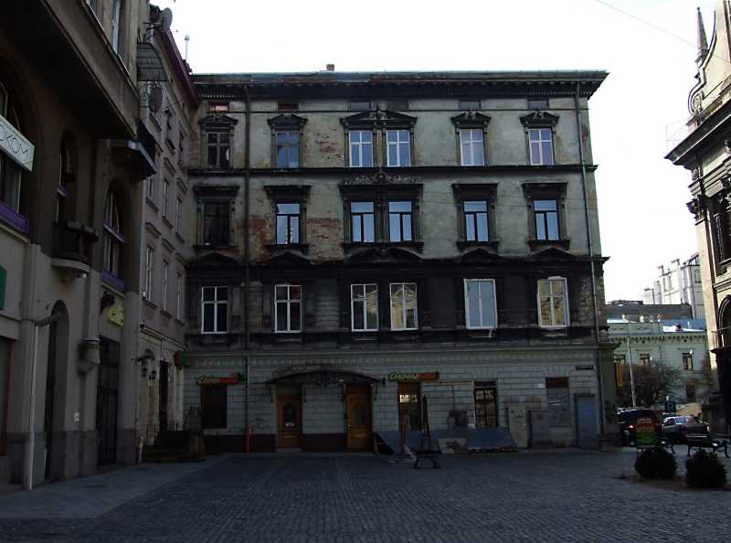 Ліворуч – будинки 1, 2 по пл. Яворського, в центрі – торцевий фасад будинку по вул. Театральній, 12, праворуч – вул. Театральна.