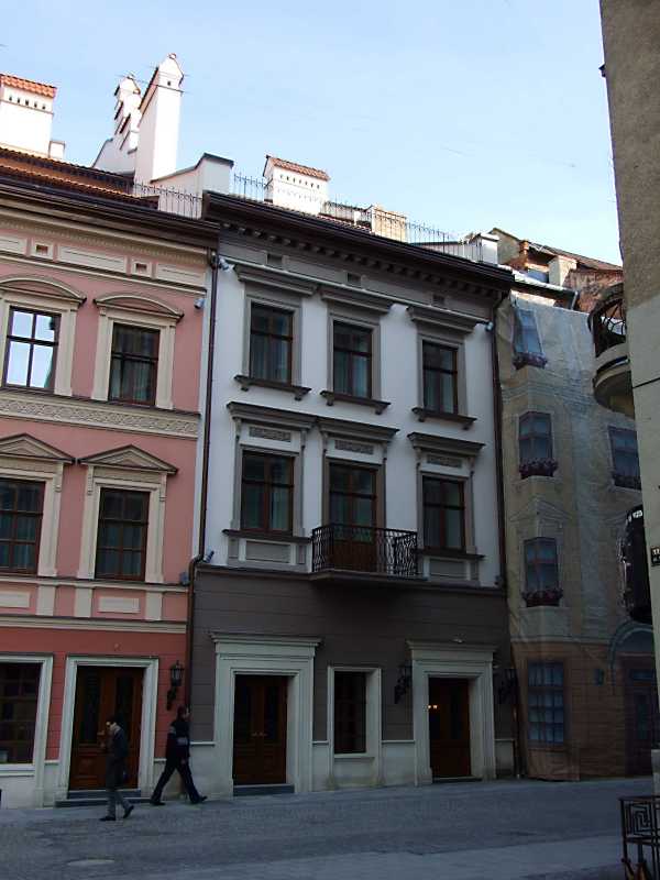 ЖИЛОЙ ДОМ. XVII в. (ул. Народной Гвардии им. И. Франко, 14). Перестраивался в конце XIX-начале XX вв. по проекту архитекторов М. Фехтера, Я. Кроха, С. Реймера. Кирпичный, вытянутый в плане, с внутренним двориком и соединенным с основным зданием флигелем. Трехэтажный гладкий оштукатуренный фасад завершен аттиком и развитым карнизом с модульонами. Его оживляют горизонтальные пояски и оконные обрамления. [Памятники градостроительства и архитектуры УССР. – К.: Будівельник, 1985 г., т. 3, с. 37 – 38].