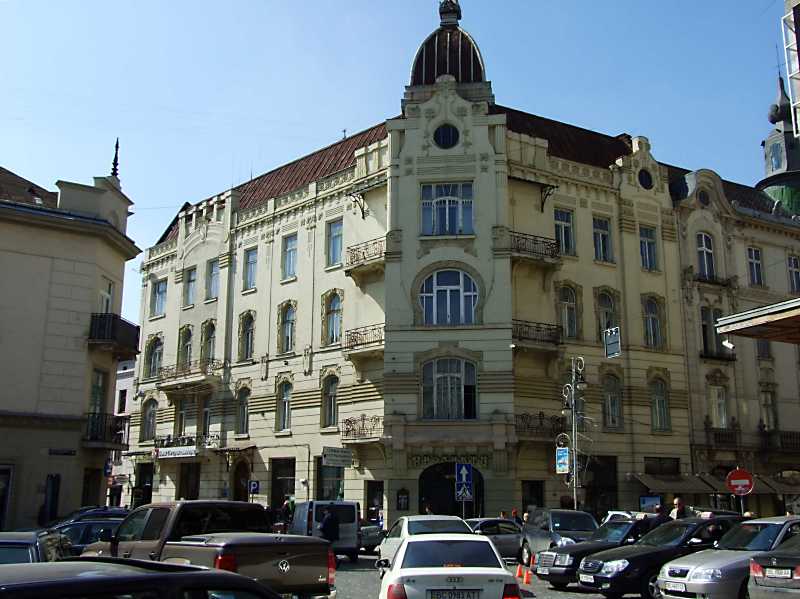 2013 р. Загальний виглядРозмір зображення: 800:599 піксел Ліворуч – вулиця Чайковського, праворуч – просп. Шевченка. 16 квітня 2013 р. Фото М.І.Жарких. |