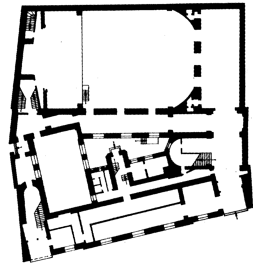 План 1 поверхуРозмір зображення: 876:927 піксел Музичне товариство Галичини. План приміщень першого поверху. Джерело: Бірюльов Ю. Мистецтво львівської сецесії. – Льв.: Центр Європи, 2005 р., с. 90. |