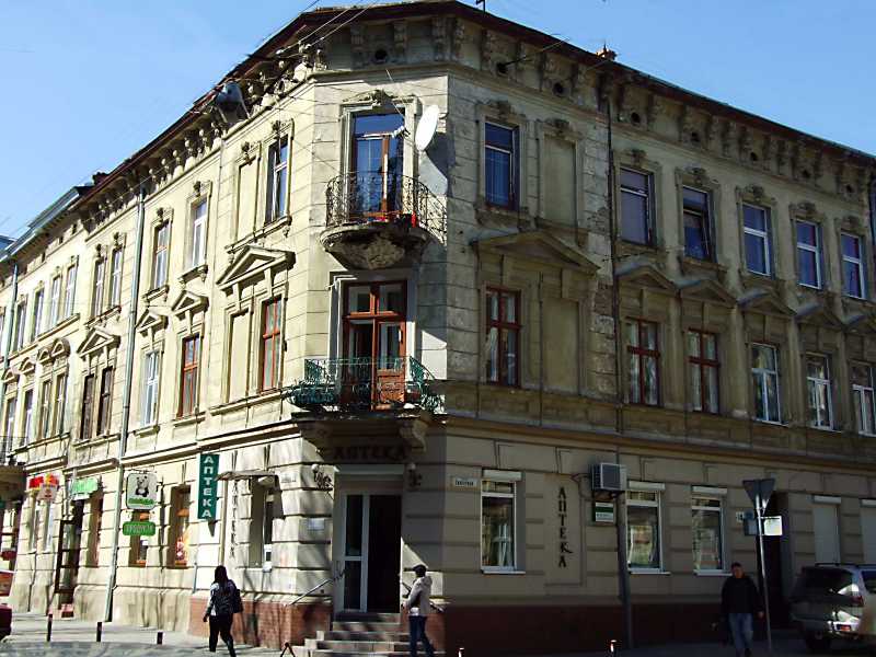 2013 р. Загальний виглядРозмір зображення: 800:600 піксел Ліворуч – вулиця Некрасова, праворуч – вулиця Сковороди. 18 квітня 2013 р. Фото М.І.Жарких. |