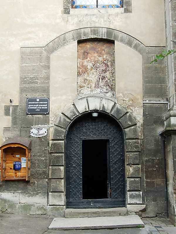 2007 р. Портал на західному фасаді, поруч із костеломРозмір зображення: 600:800 піксел 13 вересня 2007 р. Фото М.І.Жарких. |