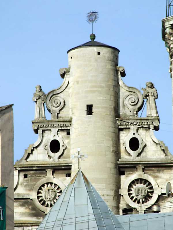 Східний фронтон костелу Розмір зображення: 600:800 піксел 4 квітня 2012 р. Фото М.І.Жарких. Попередня сторінка | Вище | Наступна сторінка