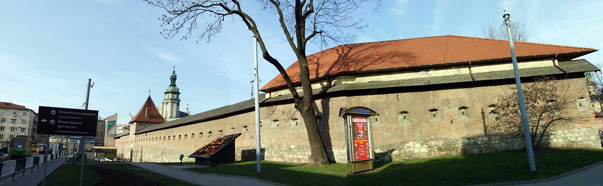 2012 р. Панорама з північного сходу Розмір зображення: 2000:617 піксел 4 квітня 2012 р. Фото М.І.Жарких. Вкладені елементи Перспектива вул. Винниченка Східний мур Північна частина східного муру