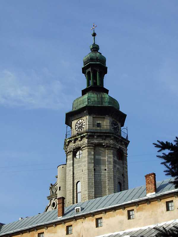 2012 р. Башта. Вигляд з північного сходу Розмір зображення: 600:800 піксел 4 квітня 2012 р. Фото М.І.Жарких. Вкладені елементи Фрагмент з годинником та люкарною