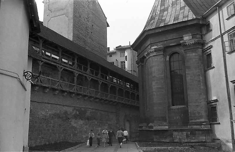 1987 р. Прохід з південного у східний двір. Вигляд з північного сходуРозмір зображення: 800:517 піксел 1987 р. 15 серпня. Фото М.І.Жарких. Негатека, № 354-24. |