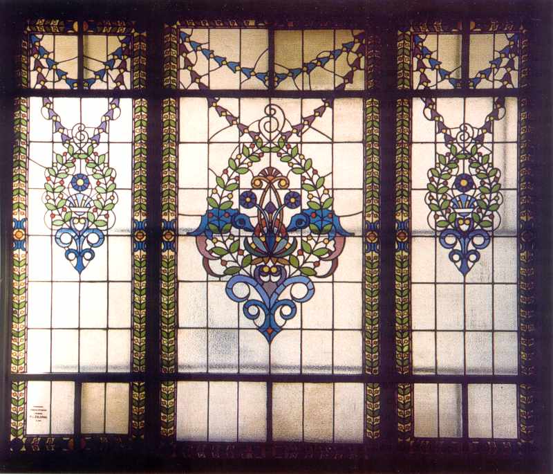 Загальний виглядРозмір зображення: 800:685 піксел Вітраж колишнього Краківського готелю (пл. Соборна, 7). Джерело: Грималюк Р. Вітражі Львова кінця XIX – початку XX століття. – Льв.: 2004 р., с. 92. |