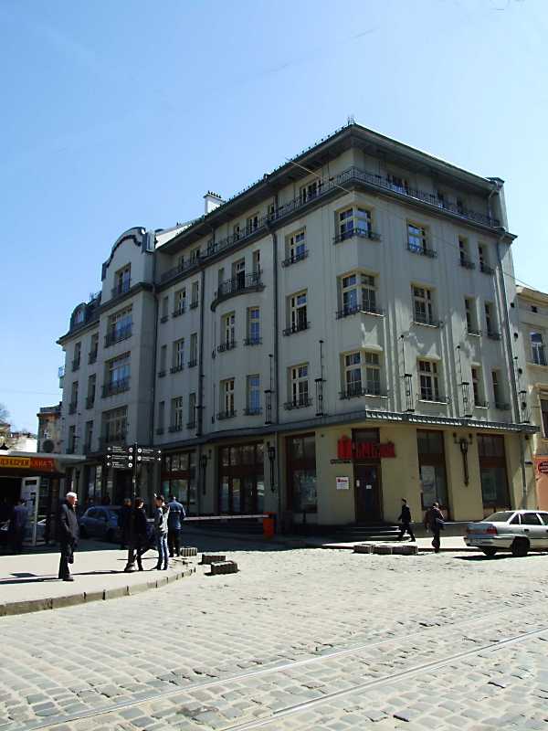 2013 р. Загальний виглядРозмір зображення: 600:800 піксел Ліворуч – площа Старий Ринок, праворуч – вулиця Б. Хмельницького. 18 квітня 2013 р. Фото М.І.Жарких. |