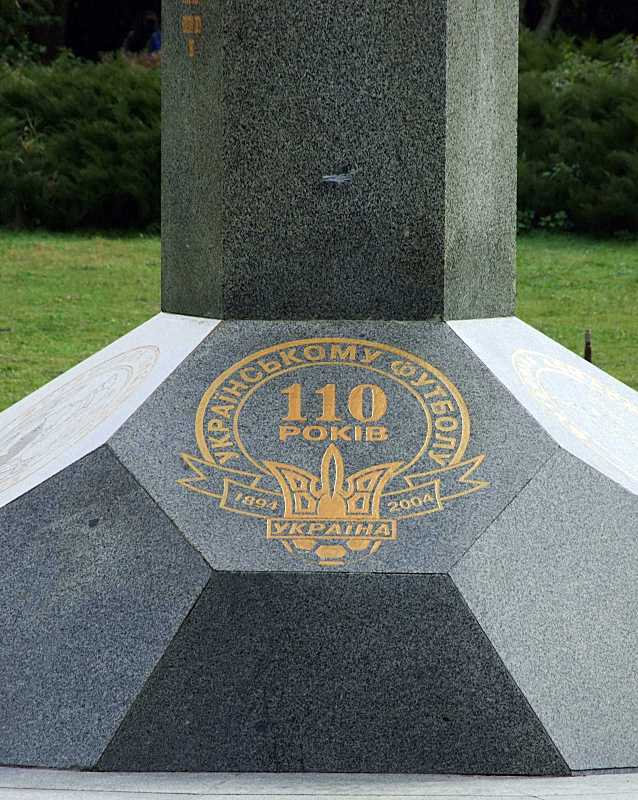 Напис на постаментіРозмір зображення: 638:800 піксел Фото М.І.Жарких, 4 жовтня 2019 р. Напис: «1894 – 2004 – 110 років українському футболу». |