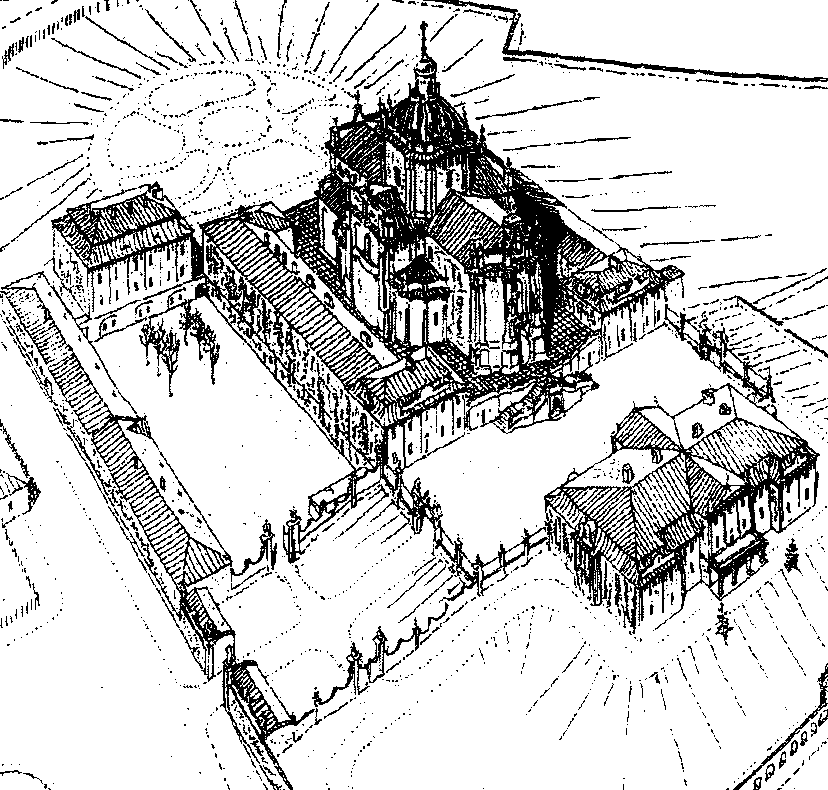 Загальний вигляд ансамблю до 1772 р. Реконструкція Я.Вітвітцького (1939 р.). З колекції Я.Вітвіцького.