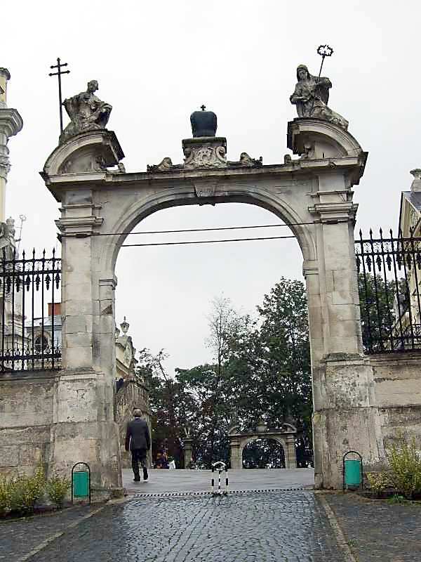 2007 р. Південна брама центрального двору Розмір зображення: 600:800 піксел 15 вересня 2007 р. Фото М.І.Жарких. Вкладені елементи Ліва постать (православна церква) Центральна частина Права постать (католицька церква) Загальний вигляд з півночі