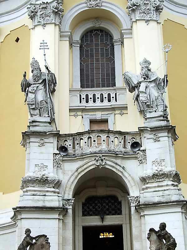 Центральна частина головного фасаду Розмір зображення: 600:800 піксел 15 вересня 2007 р. Фото М.І.Жарких. Вкладені елементи Св.Афанасій (+) Св.Лев (+)