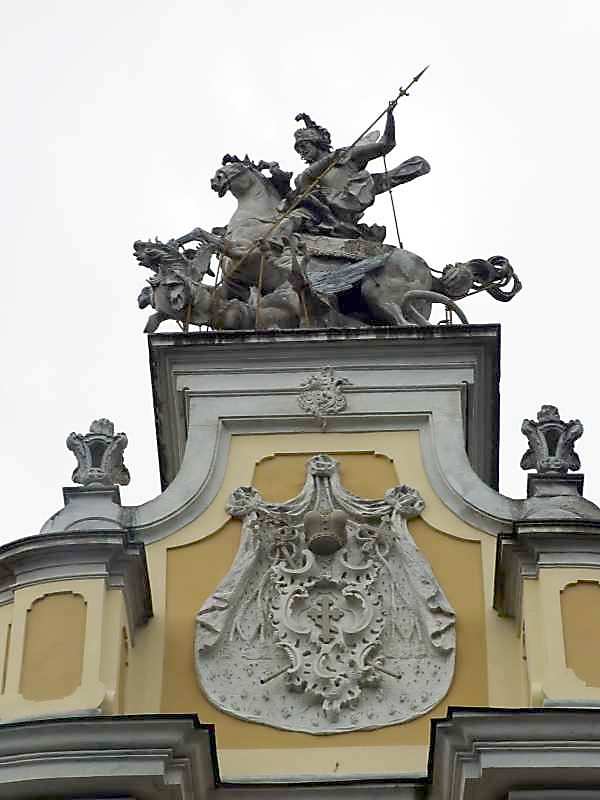 Центральна частина фронтону Розмір зображення: 600:800 піксел 15 вересня 2007 р. Фото М.І.Жарких. Вкладені елементи Св.Георгій (+) Рельєфний герб
