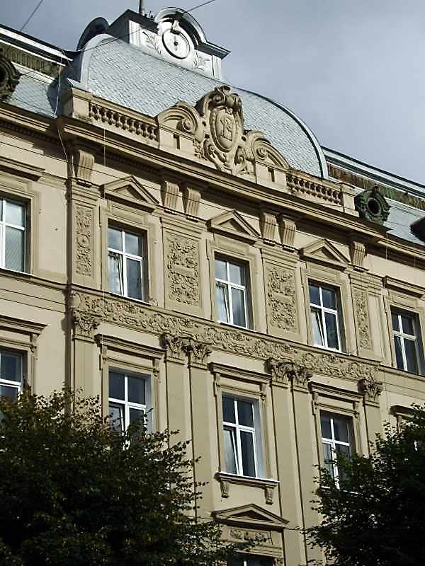 Центральна частина головного фасаду Розмір зображення: 600:800 піксел 13 вересня 2008 р. Фото М.І.Жарких. Вкладені елементи Фронтон з гербом