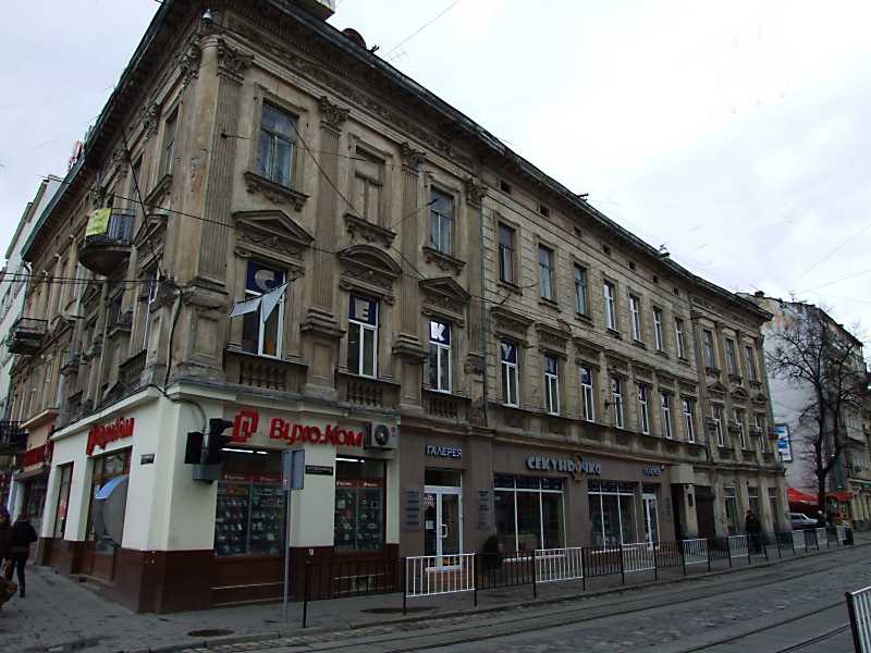 Праворуч – будинок по вул. Дорошенка, 1, фасад якого має спільне архітектурне вирішення разом з наріжним будинком № 9. 8 квітня 2012 р. Фото М.І.Жарких.