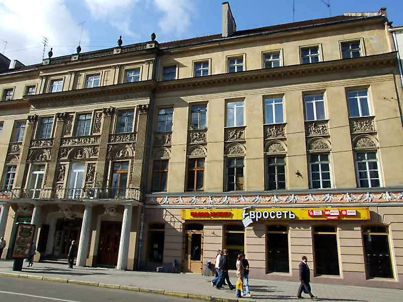 2008 р. Права частина головного фасаду Розмір зображення: 800:600 піксел 13 вересня 2008 р. Фото М.І.Жарких. Вкладені елементи Фрагмент рельєфного фриза Простінок 13 (+) Простінок 14 (+) Простінок 15 (+) Простінок 16 (+) Простінок 17 Простінок 18 (+)