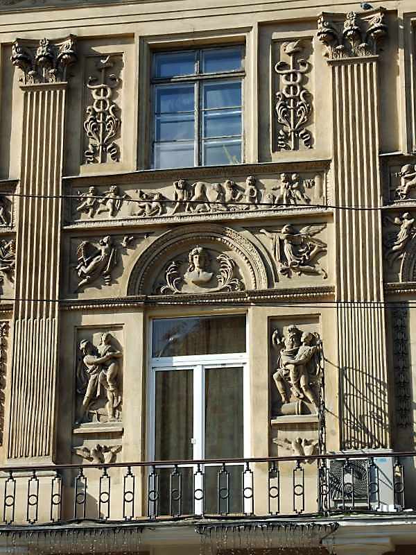 Центральна частина Розмір зображення: 600:800 піксел 13 вересня 2008 р. Фото М.І.Жарких. Вкладені елементи Рельєфна вставка і капітель пілястри Тимпан та фриз (+) Ліва ніша з рельєфом (+) Права ніша з рельєфом (+)