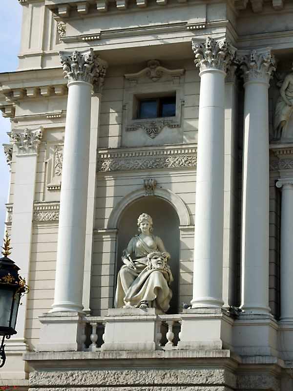 Лівий ризаліт зі скульптурою “Комедія” Розмір зображення: 600:800 піксел 13 вересня 2008 р. Фото М.І.Жарких. Вкладені елементи Скульптура “Комедія”