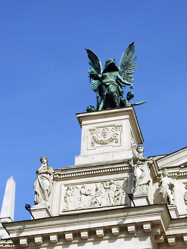 Лівий постамент зі скульптурою “Перемога” Розмір зображення: 600:800 піксел 4 квітня 2012 р. Фото М.І.Жарких. Вкладені елементи Ліва постать Рельєфна композиція Права група