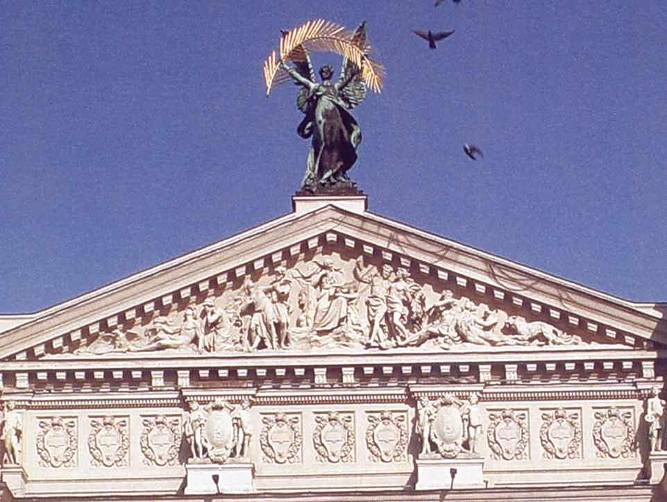 Фрагмент фасаду зі скульптурою “Слава” і тимпан з 10-фігурною композицією А.Попеля “Радощі та…