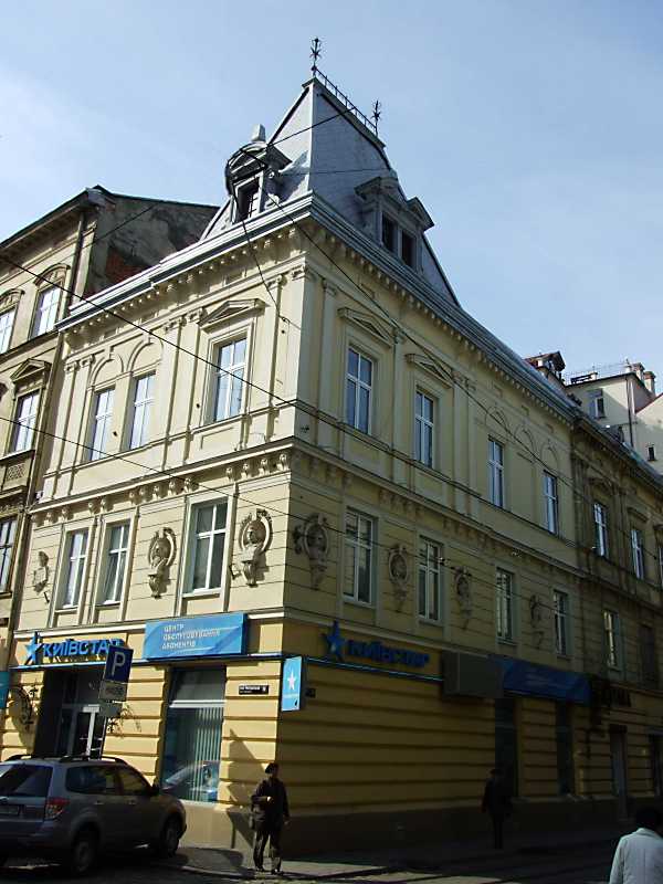 Ліворуч – вул. Театральна, праворуч – вул. Беринди. Будинок споруджено в 1892 р. за проектом Ю.К.Яновського для Владислава Людвіка Губриновича – польського книговидавця та книготорговця. Тут містилась книжкова крамниця «Губринович і Шмідт». 6 скульптур на фасадах виконав скульптор Петро Гарасимович.