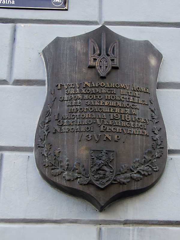 На дошці напис: «Тут, у Народному домі, знаходився щтаб збройного повстання, яке завершилося проголошенням 1 листопада 1918 року Західно-Української народної республіки (ЗУНР)».