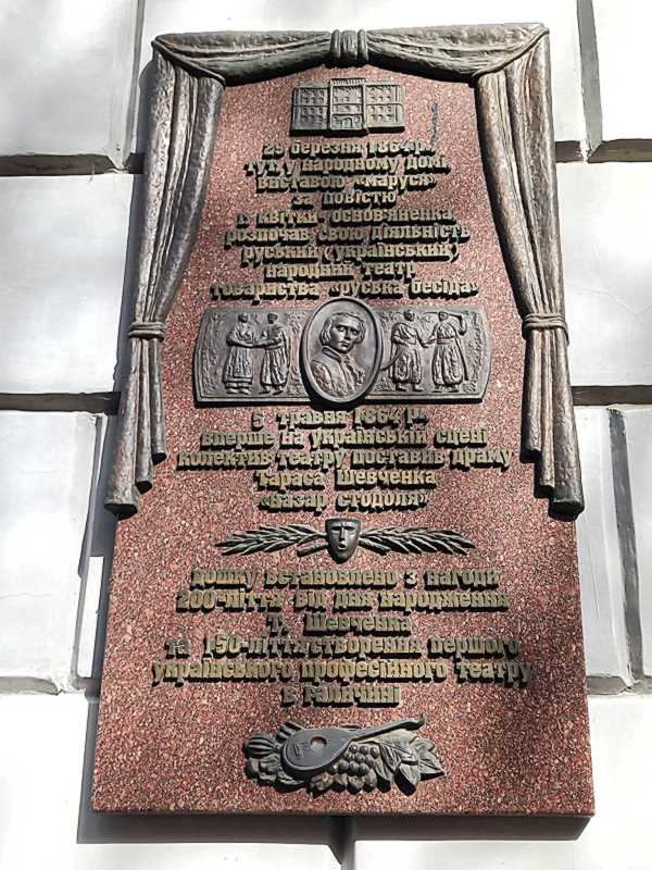 Напис: «29 березня 1864 р. тут, у Народному домі, виставою «» за повістю Г. Квітки-Основ’яненка, розпочав свою діяльність руський (український) народний театр товариства «Руська бесіда». 5 травня 1864 р. вперше на українській сцені колектив театру поставив драму Тараса Шевченка «». Дошку встановлено з нагоди 200-ліття від дня народження Т. Шевченка та 150-ліття українського професійного театру в Галичині.»