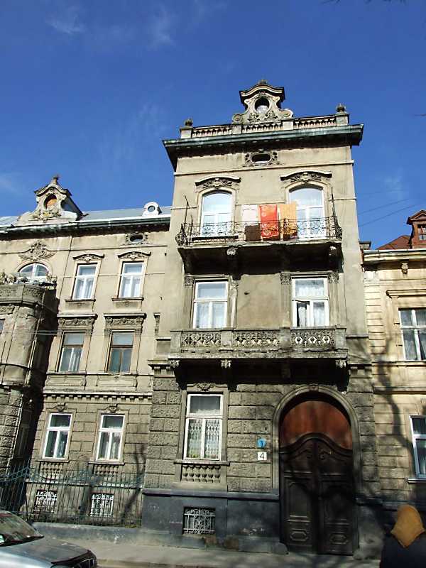 2013 р. Права частина головного фасаду Розмір зображення: 600:800 піксел 16 квітня 2013 р. Фото М.І.Жарких. Вкладені елементи Фронтон Різьблені бильця балкону 2-го поверху Вхід