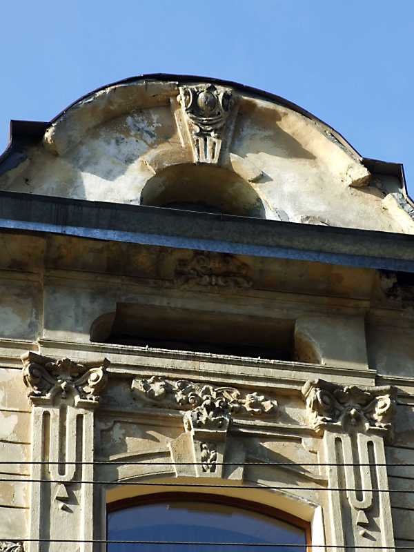 Рельєф над вікном 3-го поверху та фронтон Розмір зображення: 600:800 піксел 16 квітня 2013 р. Фото М.І.Жарких. Вище | Наступна сторінка