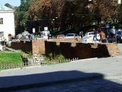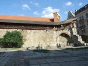 СТЕНЫ ГОРОДСКИХ УКРЕПЛЕНИЙ, конец XIV – начало XV вв. (улицы 1-го Мая, Подвальная). В середине XIV в. был основан новый центр города, расположившийся в долине р. Полтвы, южнее древнерусского предградья. Были размечены рыночная площадь и сеть улиц, сохранившаяся до наших дней. Центр городе был окружен оборонительной высокой стеной в форме неправильного четырехугольника около 1700 м в периметре. С изобретением огнестрельного оружия в начале XV в. начинается строительство второй, внешней, низкой стены со рвом и валом. Позднее городские укрепления ремонтировали и усовершенствовали. Начиная со второй половины XVIII в. Львов утратил стратегическое значение, укрепления постепенно приходят в упадок и разрушаются. Остатки их разбирают во второй половине XVIII в. Стены с башнями на расстоянии 60 м друг от друга были построены из камня и кирпича. В них были устроены Галицкие и Краковские ворота и две калитки. Внутренняя, высокая оборонная стена тянулась вдоль современных улиц Подвальной, Комсомольской, просп. Ленина и ул. Леси Украинки. К 1445 г. она включала восемнадцать башен, каждая из которых была закреплена за одним из цехов, обязанным следить за ее состоянием, боеприпасами и оборонять во время осады.