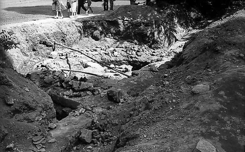 1977 р. Півбашта низького муру на вул.Підвальній (проти Братства) в ході розкопокРозмір зображення: 800:497 піксел 1977 р. 24 липня. Фото М.І.Жарких. Негатека, № A337-04. |