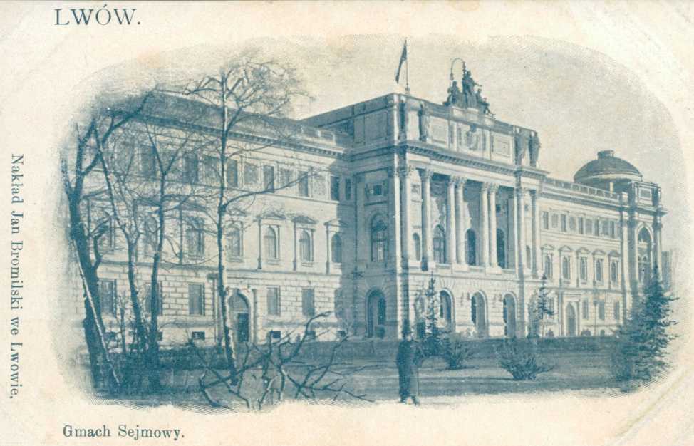 Поштівка: будинок сейму у Львові. – Lwów, gmach sejmowy. We Lwowie : nakład Jan Bromilski, [ante 1906] (pocztówka); 9 × 13 cm