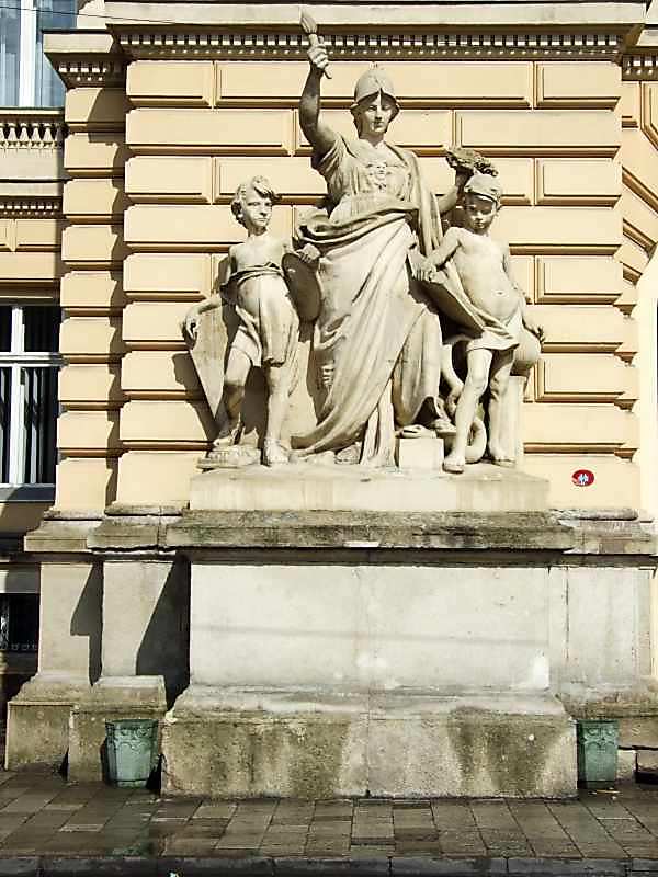 Ліва скульптурна група (Освіта) Розмір зображення: 600:800 піксел 15 вересня 2007 р. Фото М.І.Жарких. Вкладені елементи Постаті (+)