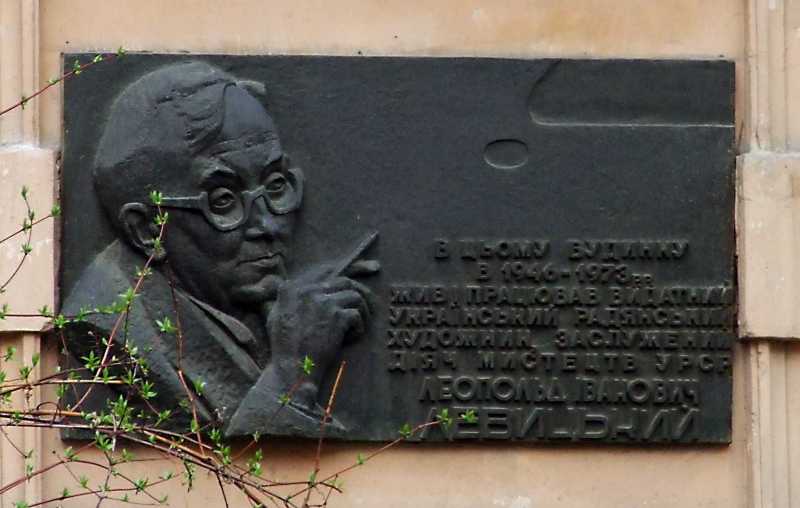 На дошці напис: «У цьому будинку в 1946 – 1973 рр. жив і працював видатний український радянський художник, заслужений діяч мистецтв УРСР Леопольд Іванович Левицький».