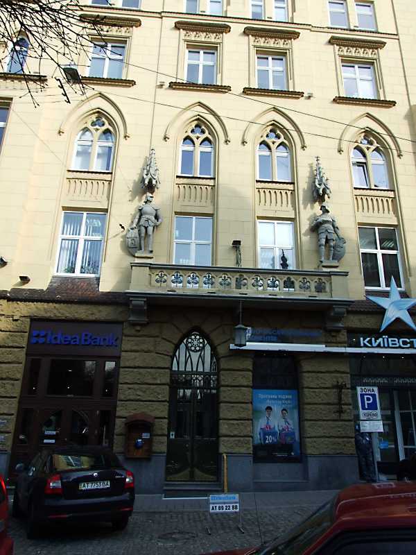 2012 р. Центральна частина головного фасаду Розмір зображення: 600:800 піксел 4 квітня 2012 р. Фото М.І.Жарких. Вкладені елементи Ліва скульптура рицаря Права скульптура рицаря