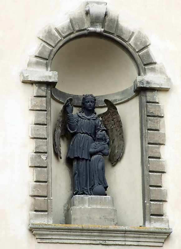 Ніша зі скульптурою архангела Розмір зображення: 581:800 піксел 13 вересня 2007 р. Фото М.І.Жарких. Вкладені елементи Архангел Рафаїл з Товієм (?)