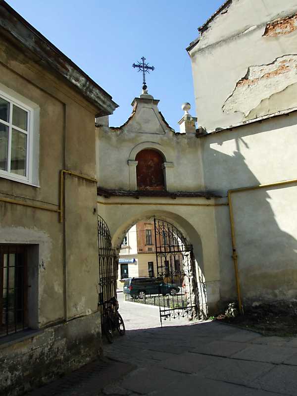2013 р. Брама. Вигляд з боку двора Розмір зображення: 600:800 піксел 18 квітня 2013 р. Фото М.І.Жарких. Вкладені елементи Живописна композиція «Боротьба архангела Михаїла з сатаною»