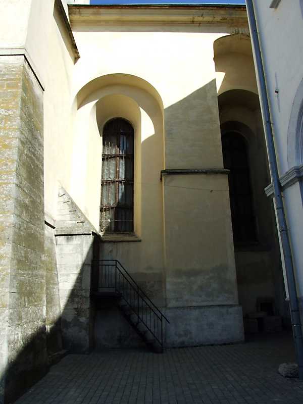 Фрагмент південного фасадуРозмір зображення: 600:800 піксел Оце закапелок між баштою (ліворуч) і корпусом келій (праворуч). 18 квітня 2013 р. Фото М.І.Жарких. |