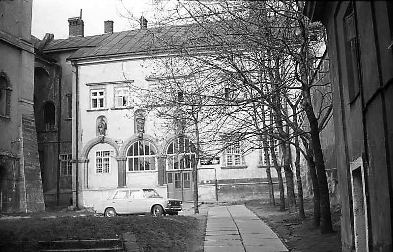 1976 р. Головний фасад південного корпусуРозмір зображення: 800:514 піксел 1976 р. 23 квітня. Фото М.І.Жарких. Негатека, № A112-28. |