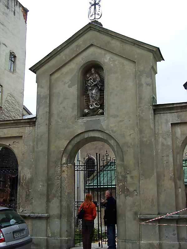 2007 р. Загальний вигляд брами Розмір зображення: 600:800 піксел 13 вересня 2007 р. Фото М.І.Жарких. Вкладені елементи Скульптура богородиці з немовлям (+)